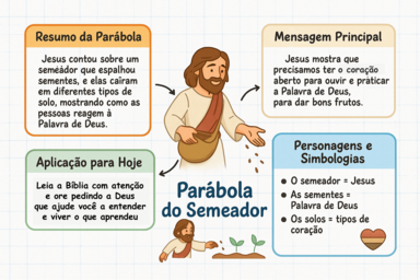 Tenha em suas mãos um guia visual exclusivo que revela as principais parábolas de Jesus em mapas didáticos com desenhos e resumos rápidos. Cada página é pensada para tornar o estudo fácil e prazeroso.